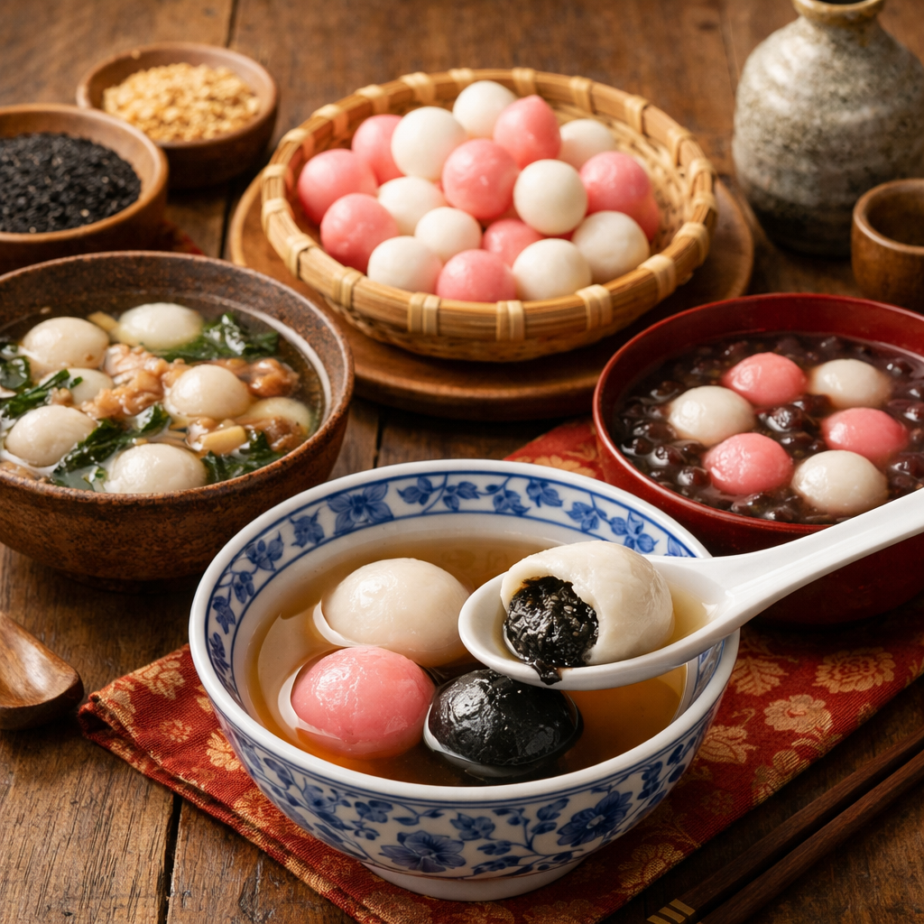 一方で、豚肉餡入りの湯圓や、餡の入っていない小さな湯圓を、だしの効いた塩味のスープに入れた「鹹湯圓(シエンタンユエン)」も家庭料理として親しまれています。こちらは、日本のお雑煮に近い感覚で、寒い季節に体を温めてくれる一品です。